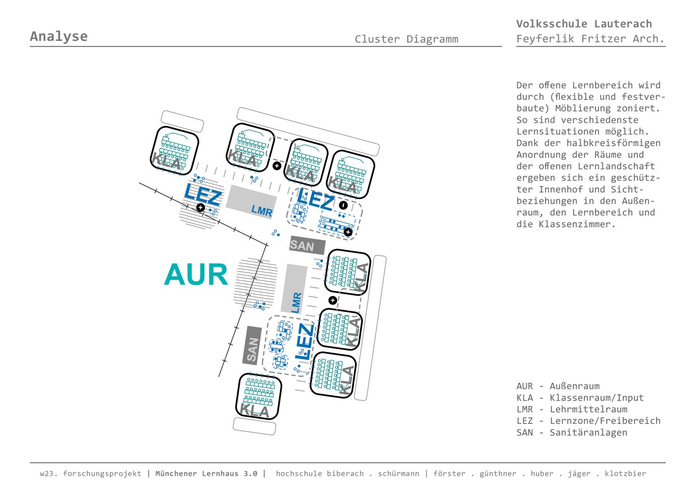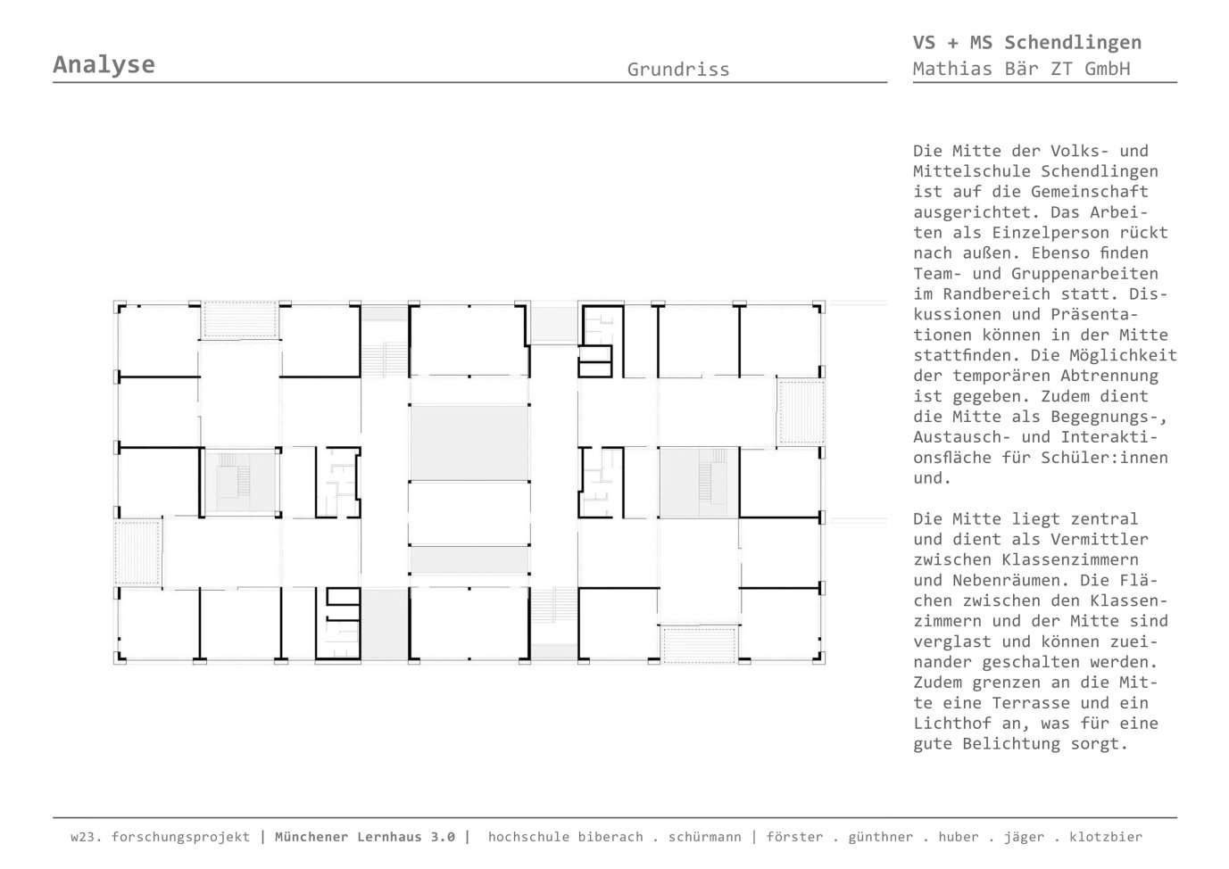Die folgenden Schulen wurden hinsichtlich ihrer „Mitten“, das heißt den Räumen außerhalb der eigentlichen Klassenzimmer analysiert. Es wird sich auf die Mitten unmittelbar zu den Klassenräumen beschränkt. Die Analysen richten sich hauptsächlich nach personenbezogenen und handlungsorientierte Lernsituationen, aber auch räumliche Kriterien wurden betrachtet. Im Rahmen dieser Analyse wurden die zentralen Orte, an denen sich die ganze Schule trifft wie Aula, Mensa usw. außer Acht gelassen.