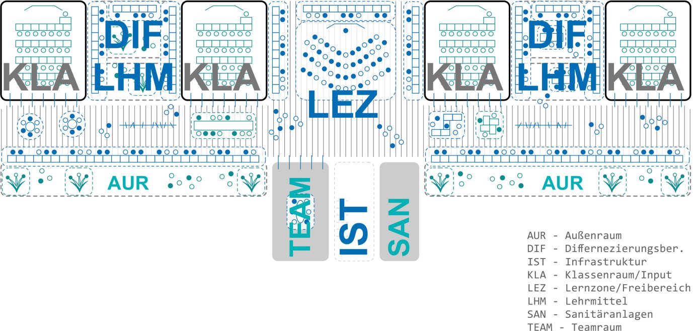 Beispiele räumliche Kriterien: Türen/Raumeingang, Sichtverbindungen, visuelle Verbindungen (Beaufsichtigungsmöglichkeiten), Außenflächen, Raumabschluss/Fassade, Glasflächen, Tageslicht (Lichthof/Fenster), Treppen, Klassenzimmer, Gruppenräume, Team/Lehrerinnen, Garderoben, Sanitär, Freie Arbeit