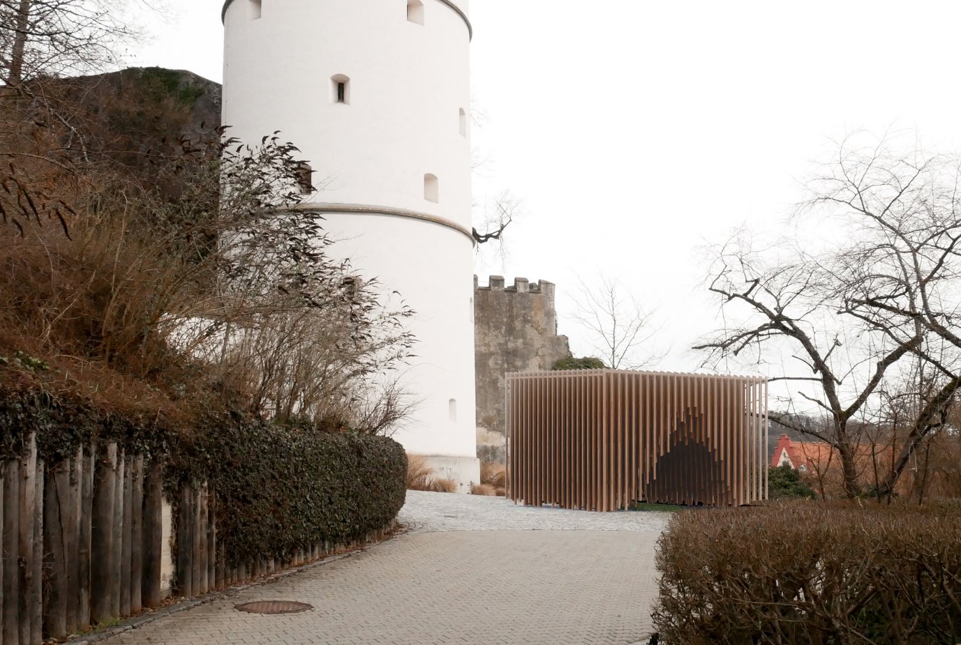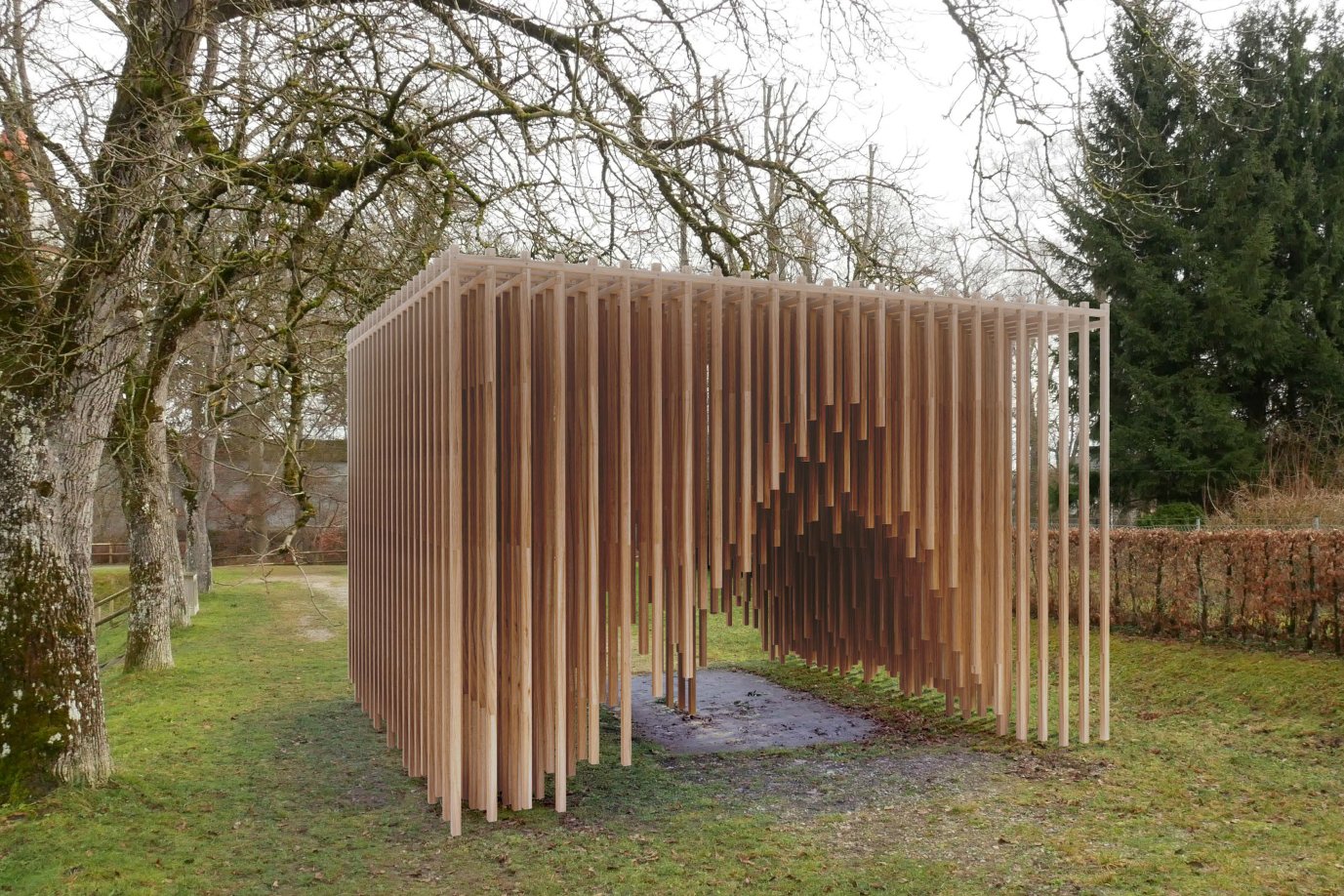Der gezeigte studentische Entwurf besteht aus Holzelementen, deren variable Längen einen durchlässigen Negativraum umfassen. Die organische Form dieses Raums steht im Kontrast zur streng geometrischen Außenform. Das Gefüge erzeugt spannungsreiche Durchblicke und Muster aus Licht, Schatten und Transparenzen, die sich mit dem Betrachtungswinkel und der Lichtrichtung ändern. Die stabförmigen Holzelemente sind punktuell in unregelmäßigen Abständen am Boden platziert und über horizontale Elemente verbunden. Geschraubte Verbindungen ermöglichen eine einfache Montage und Demontage, die einen Einsatz an verschiedenen Orten ermöglichen.