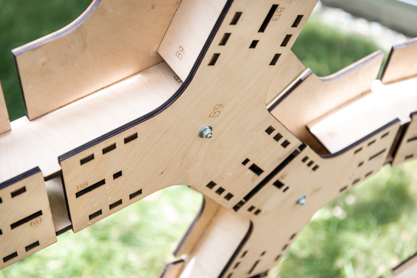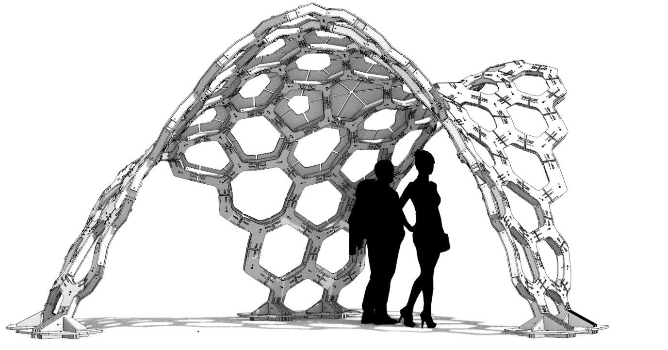 Carapacks ist das Ergebnis eines Design-Build-Projekts, das über mehrere Semester an der Architekturfakultät der Hochschule Biberach stattfand. Das Team um Simon Vorhammer, Dr. Jonas Schikore, Dr. Christina Jeschke und David Ott entwickelte ein Konzept, um beliebig gekrümmte Freiformflächen als doppelschalige Stecksysteme umzusetzen. Die Besonderheit des hexagonalen Systems besteht darin, dass alle Teile krümmungs- und torsionsfrei sind und lotrechte Schnittkanten aufweisen. Dadurch ist eine effiziente und kostengünstige Fertigung mittels 2,5-achsiger CNC-Laser- oder Wasserstrahlschneidetechnik gewährleistet. Die Montage gestaltet sich unkompliziert und kann ohne den Einsatz schwerer Geräte und von versierten Laien durchgeführt werden. Die Bezeichnungen und Positionen sind in die Bauteile eingebettet. Dadurch können die geometrisch einzigartigen Platten mühelos und ohne die Notwendigkeit von Plänen zusammengesetzt werden – ähnlich wie bei einem Puzzle. Die Planarität erlaubt ein raumsparendes Stapeln. So passen zum Beispiel alle Einzelteile der im Folgenden gezeigten Konstruktionsstudie in die Kofferräume zweier Kombis. Das digitale parametrische Modell ermöglicht es, verschiedene Eingangsparameter wie Gesamtform, Geschlossenheitsgrad, Schalenstärke und Größe der Segmente zu definieren. Dadurch lassen sich nahezu instantan fertigungsreife Bausätze für unterschiedlichste Ausgangsgeometrien erzeugen. Zur Erprobung der Steckmechanik wurde im Sommer dieses Jahres ein Pavillon im Maßstab 1:1 aus 592 Holzelementen an der Hochschule errichtet. Nach einer Standzeit von etwa sechs Wochen wird dieser demontiert, um im nächsten Jahr an anderer Stelle auf dem Campus wieder aufgebaut zu werden. Das System ist nicht auf Holzpavillons beschränkt, sondern könnte auch auf Überdachungen und Fassaden übertragen werden. Die Materialbeständigkeit kann durch die Wahl von Holz für den Außenbereich oder die Verwendung anderer wetterfester plattenförmiger Materialien sowie Holzbehandlungen gewährleistet werden. Regendichtigkeit könnte durch eine zusätzliche, außen liegende, transparente Hülle, zum Beispiel aus ETFE, hergestellt werden.