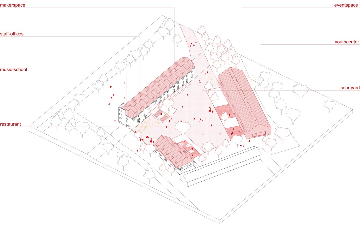 Die ehemalige „Zichorienfabrik Günzburg“ wird zu einem modernen Kultur- und Begegnungszentrum umgestaltet, das Räume für Veranstaltungen, Jugendangebote, eine Musikschule und ein Restaurant bietet. Der Entwurf ergänzt die historische Bausubstanz mit neuen Elementen und schafft einen zentralen Innenhof als Ort für Märkte, Freizeit und Gemeinschaft.