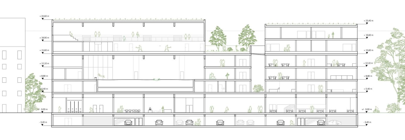 Zwei große städtische Grundstücke in München direkt an der Isar-Tangente, angrenzende an die Wittelsbacherschule werden mit einem neuen urbanen Multi-Use-Sport-/ Schul-und Kinderzentrum bebaut. Das Zentrum soll durch Kinder/ Schüler, Vereine aber auch die Bewohner des angrenzdenden Viertel und der näheren Umgebung genutzt werden können. Gleichzeitig soll die Rolle der entstehenden Außenräume für das Glockenbachviertel mit bedacht werden. Funktionale Kernelemente sind eine Schwimmhalle, eine Einfach- oder Zweifach-Sporthalle, ein Kindergarten sowie Erweiterungsräume für die Schule.