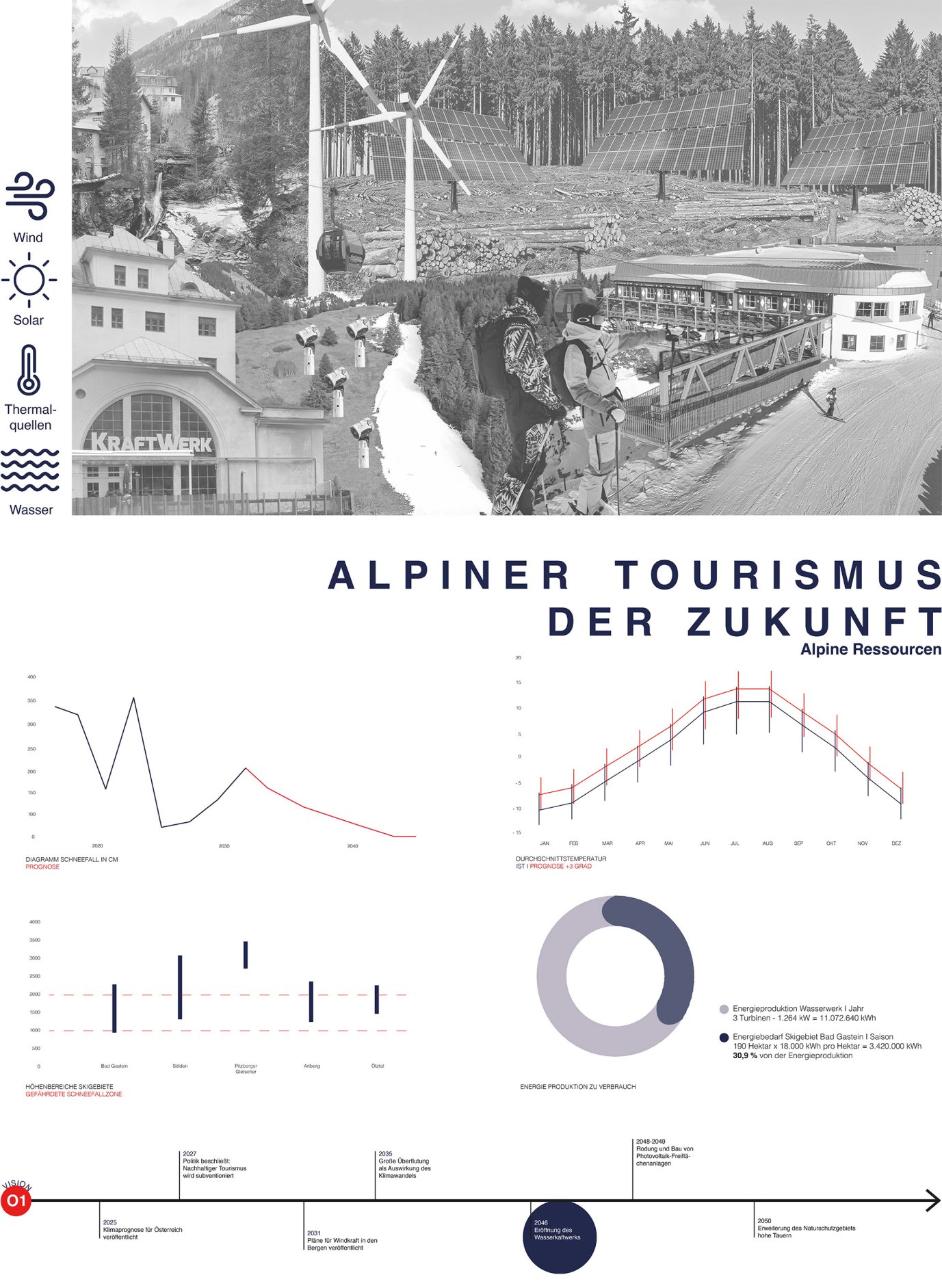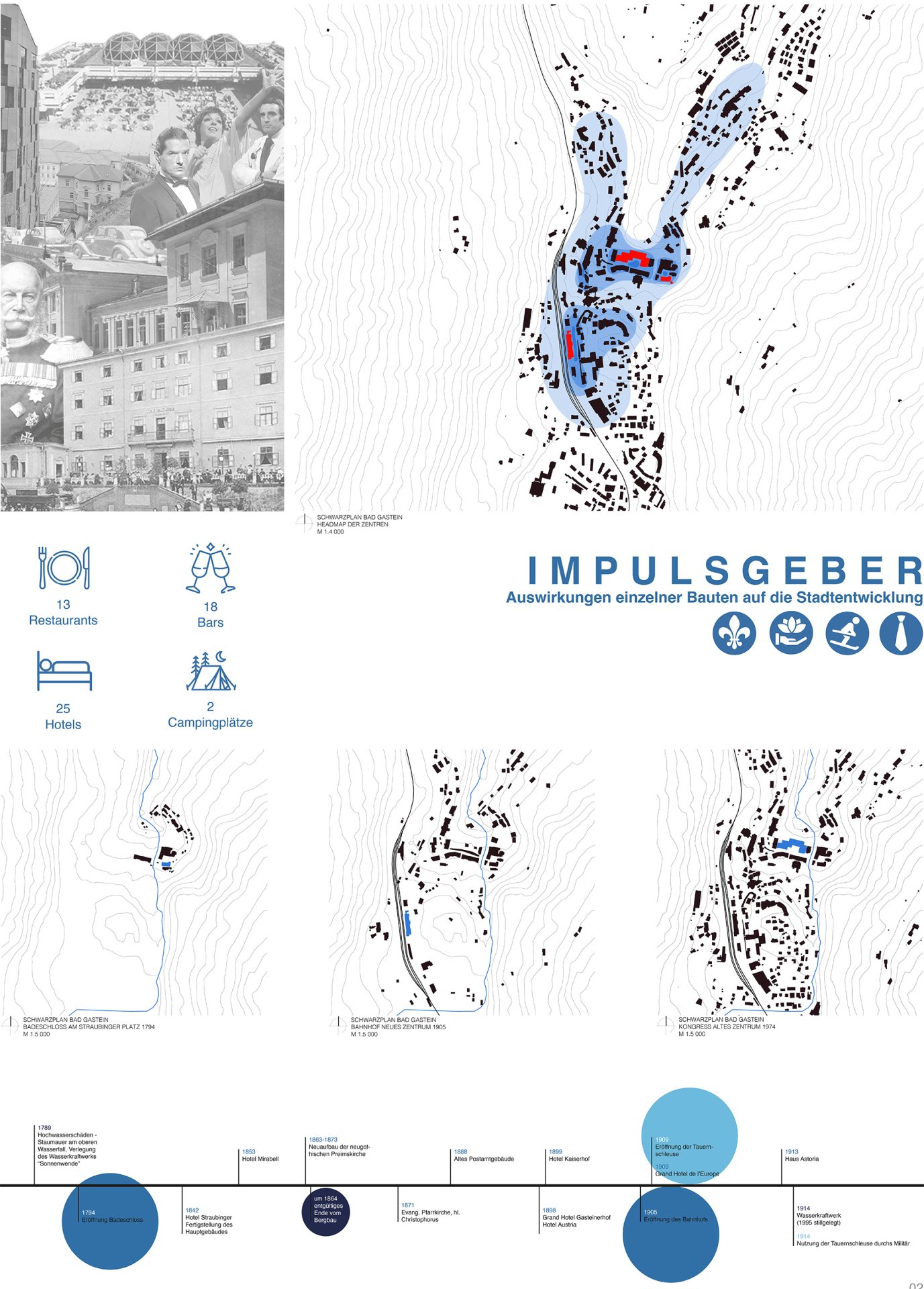 Die Arbeit baut auf profunde vielseitige Recherche und leitet daraus visionäre aber plausible Zukunftsideen für den Kur- und Wintersportort Bad Gastein ab. Sie nähert sich dem Charakter der kleine morbid glamourösen Stadt inmitten der Alpen damit behutsam an und schreibt die Eigenarten des Standortes fort.