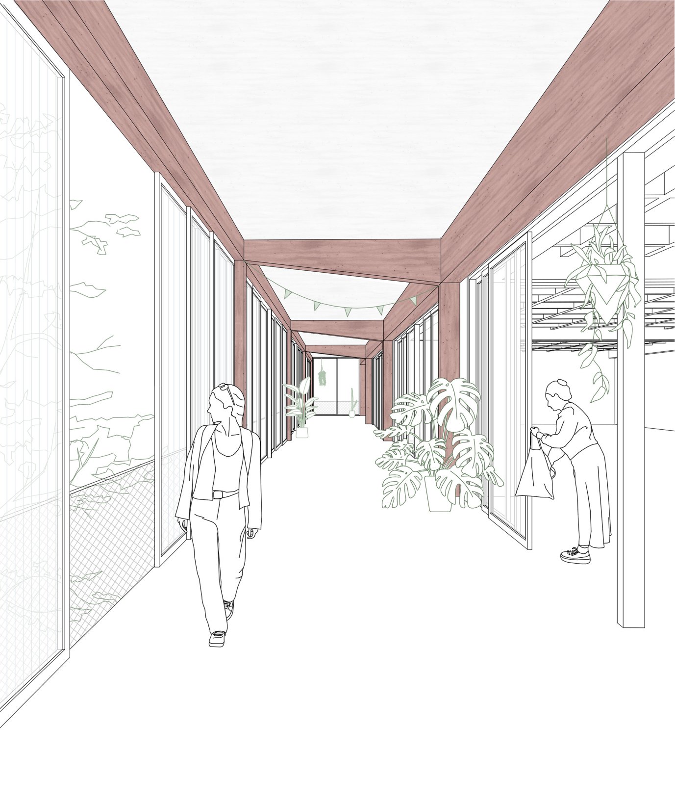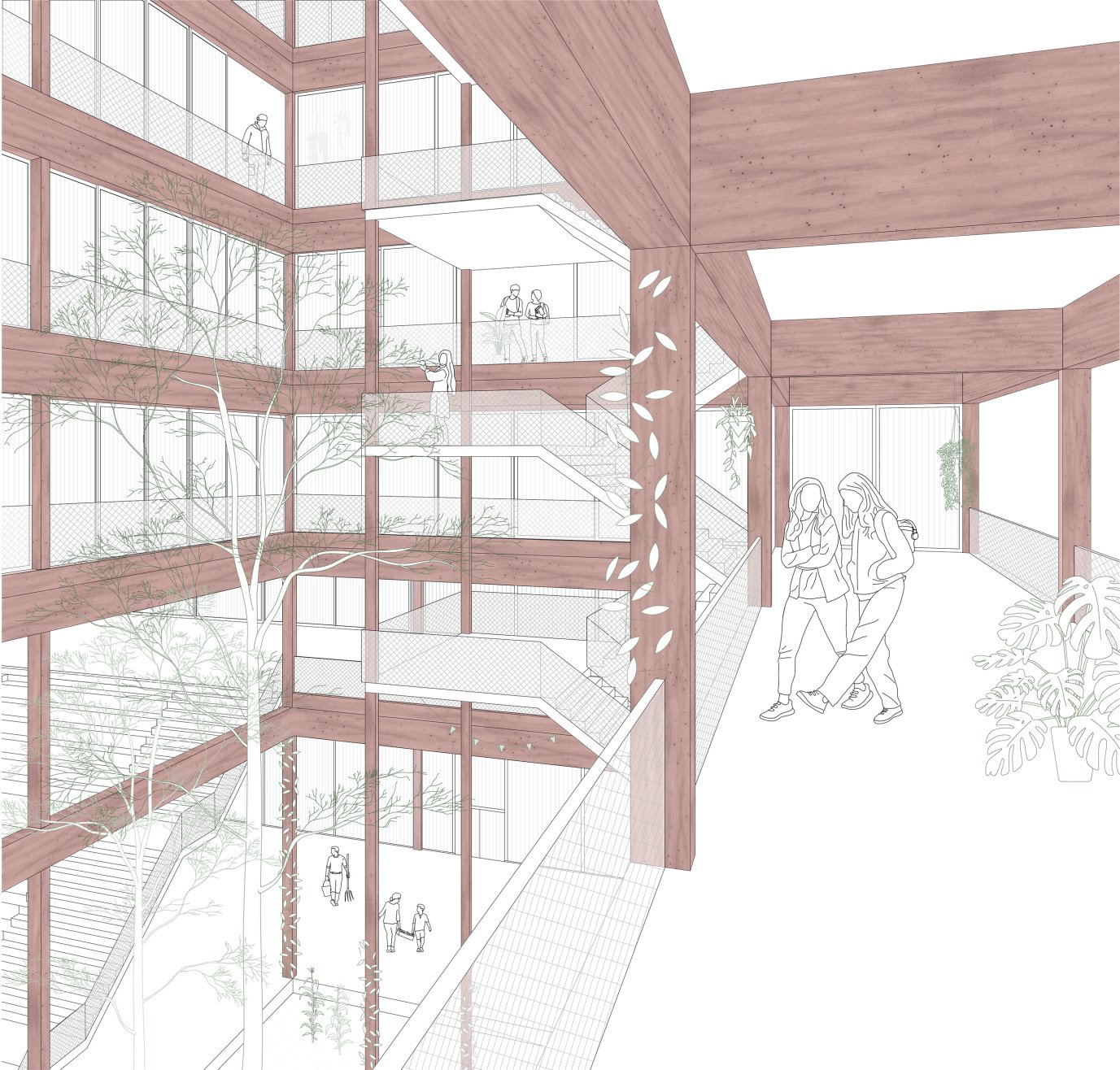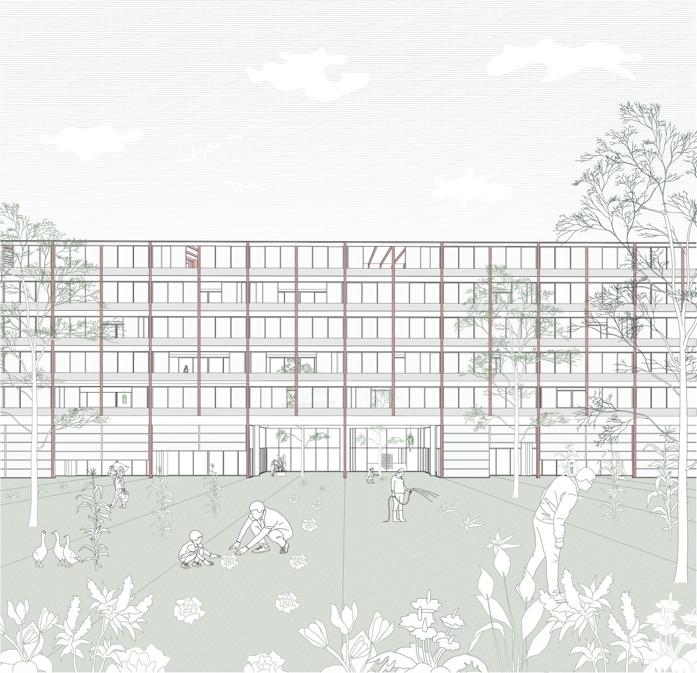 Campus Allmende ist ein offener Universitätscampus für Agrarinnovation in Berlin-Rummelsburg, der Forschung, Alltag und produktive Landschaft zu einem gemeinsamen Lernort verbindet. Auf einer ehemaligen Asphaltfläche entsteht durch Entsiegelung, großzügige Freiräume und kompakte Bebauung eine neue Kulturlandschaft zwischen Bahn und Spree. Die Universität bietet offene Lern- und Arbeitsräume, flexible Strukturen aus Holz und Lehm und sichtbare Forschungsprozesse, die Austausch zwischen Studierenden, Wissenschaft und Öffentlichkeit ermöglichen. Eine durchgehende Pufferzone sowie begrünte Innenhöfe schaffen angenehme Klimaräume und verbinden Innen und Außen zu einer lernfähigen Umgebung. Die große Forschungsebene im Dachgeschoss verknüpft Versuch, Beobachtung und Lehre innerhalb einer ressourceneffizienten und wandelbaren Konstruktion.