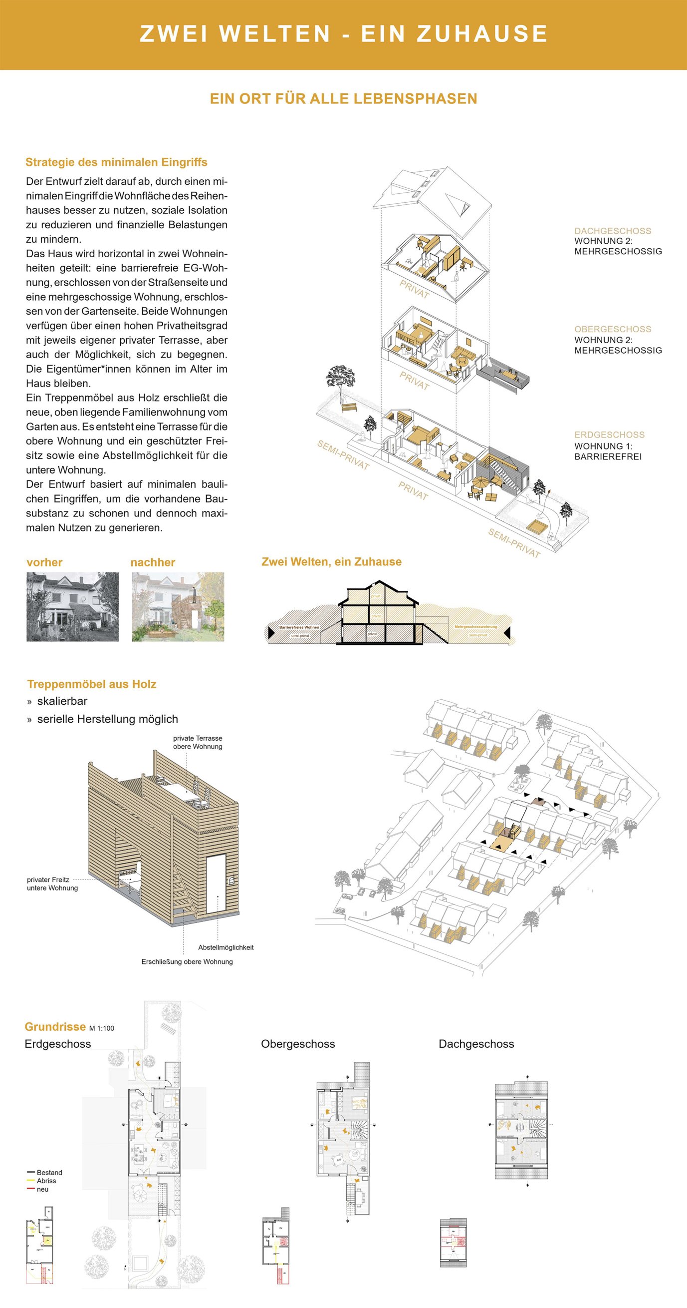 Das Einfamilienhaus ist die beliebteste Wohnform der Deutschen. Bundesweit gibt es 16 Millionen davon, und ein großer Teil dieser Häuser ist untergenutzt. Es sind Zimmer frei – und gleichzeitig fehlt es an Wohnraum. In einem Entwurfsstudio wurden am Beispiel von vier Häusern in Göttingen verschiedene Strategien erarbeitet, wie die freien Zimmer sich zum verdichteten Wohnen nutzen ließen - ausgehend von den Anforderungen und Wünschen der Eigentümer*innen und unter sozialen, ökologischen und ökonomischen Aspekten. Die Studierenden formulierten konkrete Ideen und Ansatzpunkte für neue Nutzungskonstellationen, für bauliche Veränderungen und für kommunales Handeln.Die Ausstellung wurde sowohl im Stadtteil Weende Nord als auch im Neuen Rathaus Göttingen präsentiert. Die Ausstellungsgestaltung entstand im Rahmen eines Wahlpflichtfaches.