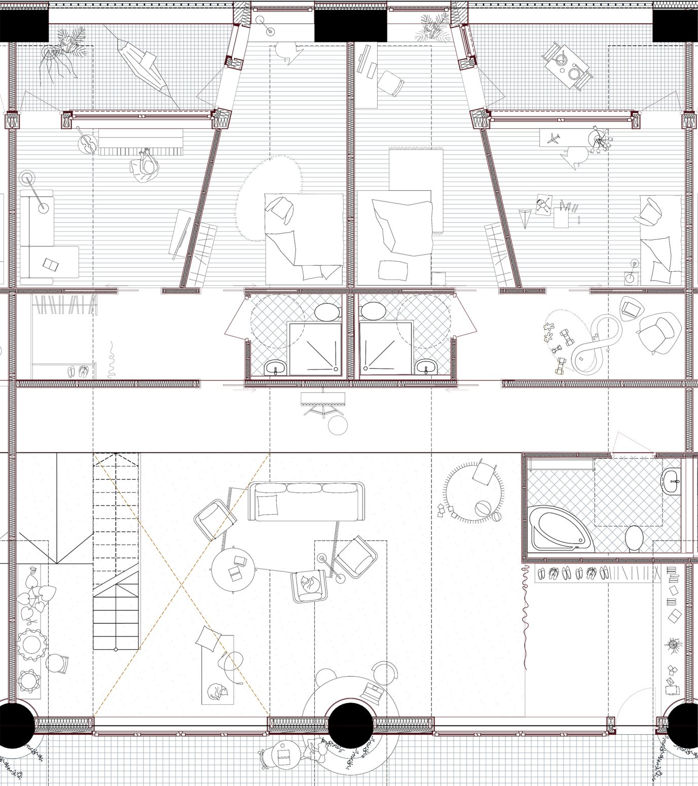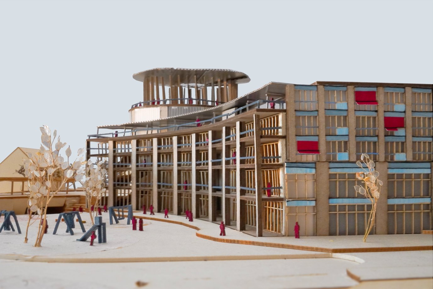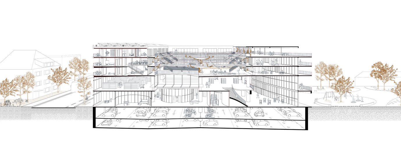 Ziel der Entwurfsaufgabe ist die Transformation eines Parkhauses mit zwei Unter- und fünf Obergeschossen in Friedrichshafen. Das Bestandesgebäude aus den 80er Jahren verfügt über eine weitspannnende Stahlbetonstruktur, welche mehrheitlich weiterverwendet werden soll. Nebst einem Supermarkt, Quartierzentrum soll soll im Gebäude oder durch eine kluge Aufstockung Wohnraum für eine heterogene Zielgruppe entstehen.