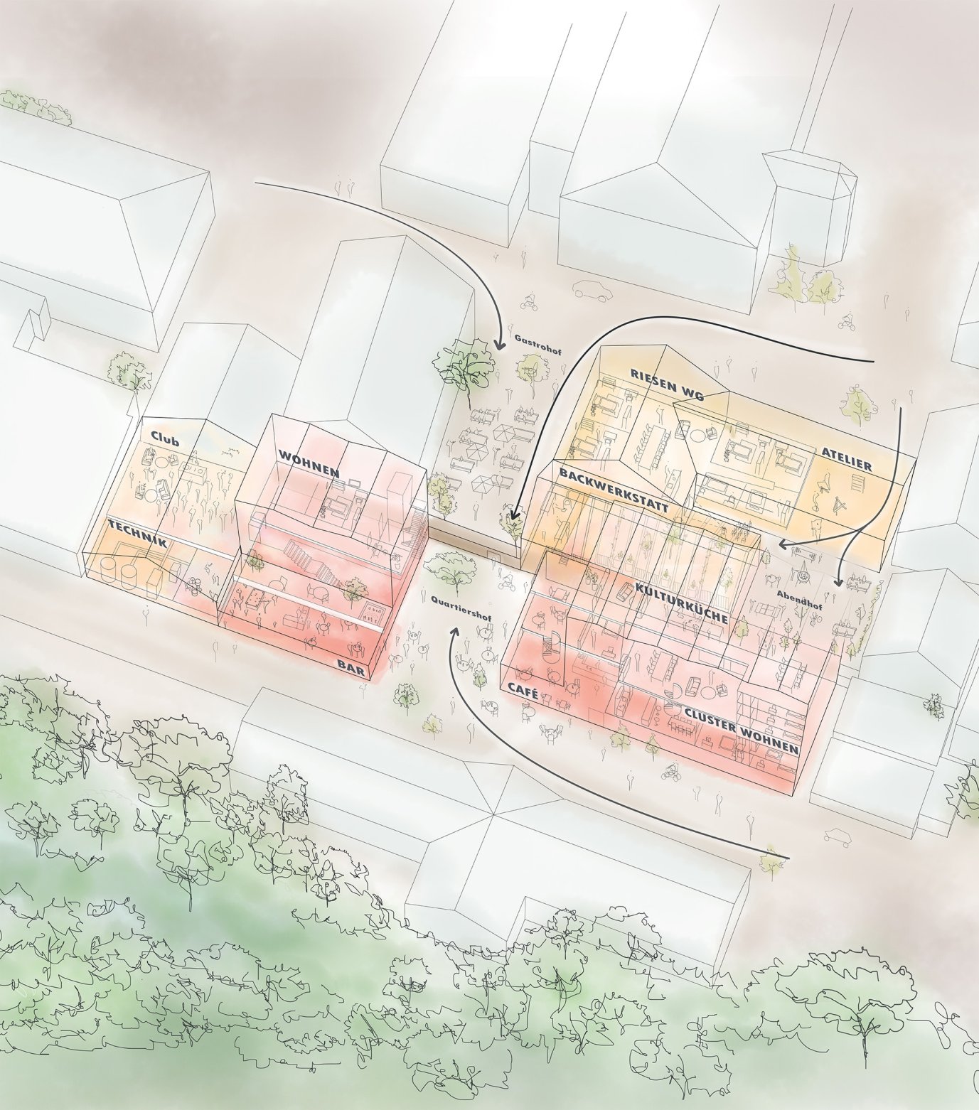 Der «Grüne Baum» ist eine ehemalige Brauerei am südlichen Rande der Altstadt von Biberach mit einem zwar in die Jahre gekommenen, aber bis vor kurzem noch sehr beliebten Gasthof mit einfachen und günstigen Gastzimmern. Seit Corona ist der Gasthof geschlossen und in der Folge ist das weitläufige Areal an eine Immobilienfirma verkauft worden. Soweit die Pläne öffentlich waren, sollen die bestehenden Bauten abgerissen und durch eine historisierende Wohnbebauung ersetzt werden. Dabei würde ein wesentlicher Ort der kollektiven Erinnerungskultur von Biberach verloren gehen. In öffentlichen Foren wurde gegen die Pläne protestiert. Mit der Entwurfsaufgabe im Konstruktiven Entwurf haben wir untersucht, inwieweit es möglich ist, trotz Erhaltung der wesentlichen historischen Bauten das Areal einer neuen baulichen Zukunft zuzuführen. Durch rentable Nutzung von Neubauten könnten kulturelle Nutzung in den Altbauten mitfinanziert werden.