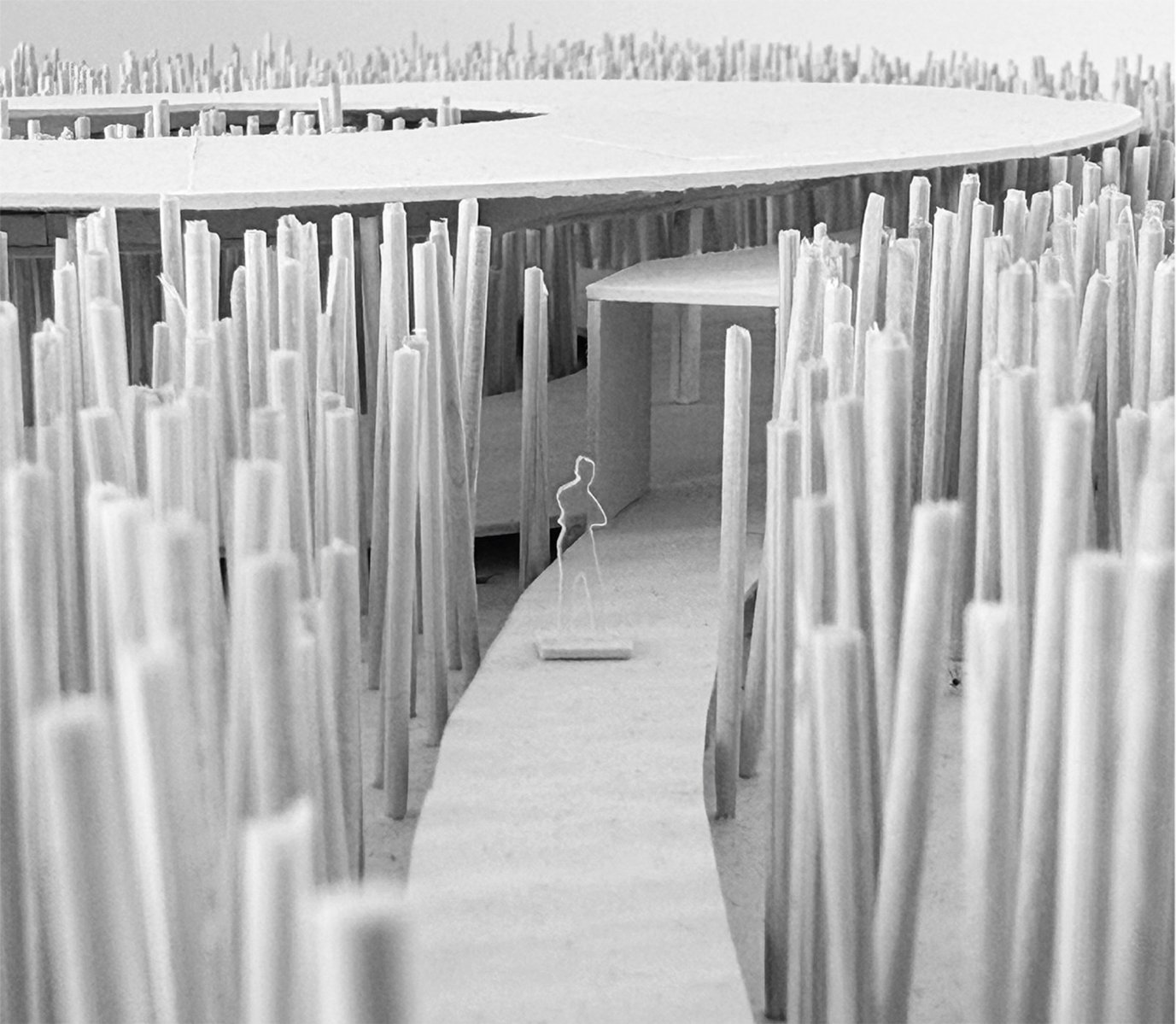Der Entwurf für eine Bibliothek am Rand des Schilfgürtels ist ein Ort der Information und der Kontemplation. In dem kreisrunden Bau kann man sich über die Welt der Pflanzen und Tiere informieren, er bietet aber auch die Möglichkeit des Rückzuges inmitten der Natur. Die sehr präzise Setzung des klaren, einfachen Baukörpers im Schilf lässt ganz unterschiedliche räumliche Beziehungen zwischen Innenraum und Aussenraum entstehen: offene und geschlossene, solche mit Weitsicht und solche mit Blick direkt in den Schilfwald. Grösse, Form und Konstruktion sind sehr stimmig aus der Grundidee und den Bedingungen des Ortes entwickelt. Der Ausdruck des Gebäudes ist klar und elegant.